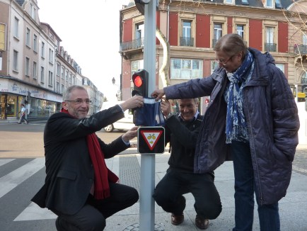Sitôt paru l’arrêté le 12 janvier 2012 autorisant le tourne à droite pour les vélos aux feux rouges, la municipalité a dévoilé aujourd’hui son premier panneau.