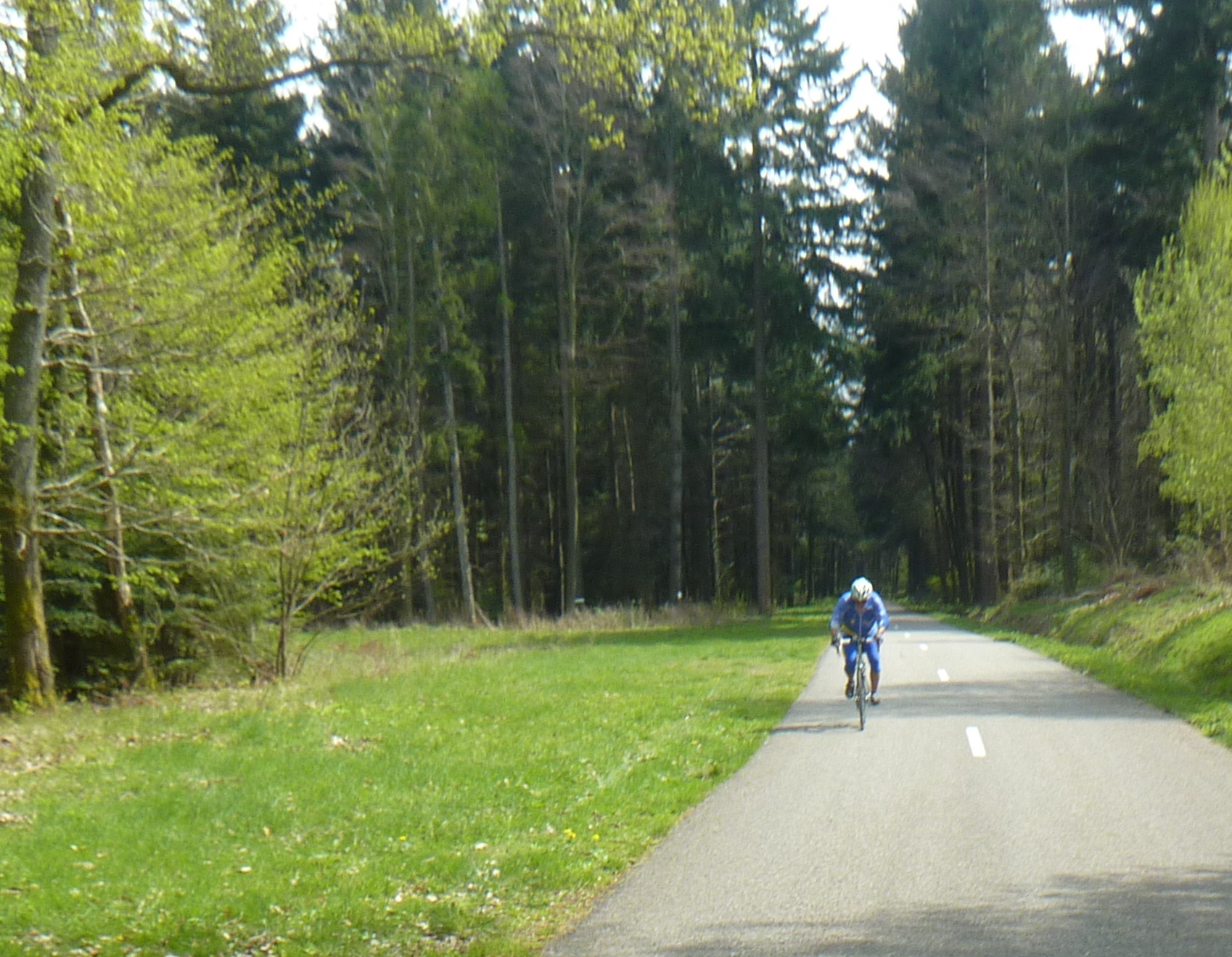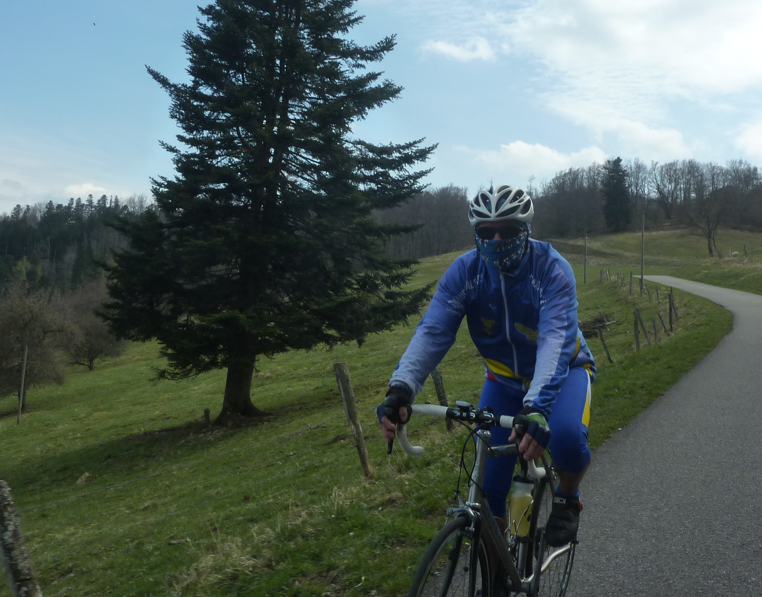 Mais à l’embranchement de la route d’Uffoltz, c’est pas mieux…ça monte toujours avec des variations de pentes nombreuses qui obligent à se remettre en questionle cardio monte, la vitesse baisse, on envisage de changer de braquet tandis que les gouttes de sueur perlent sur la visière de la casquette.