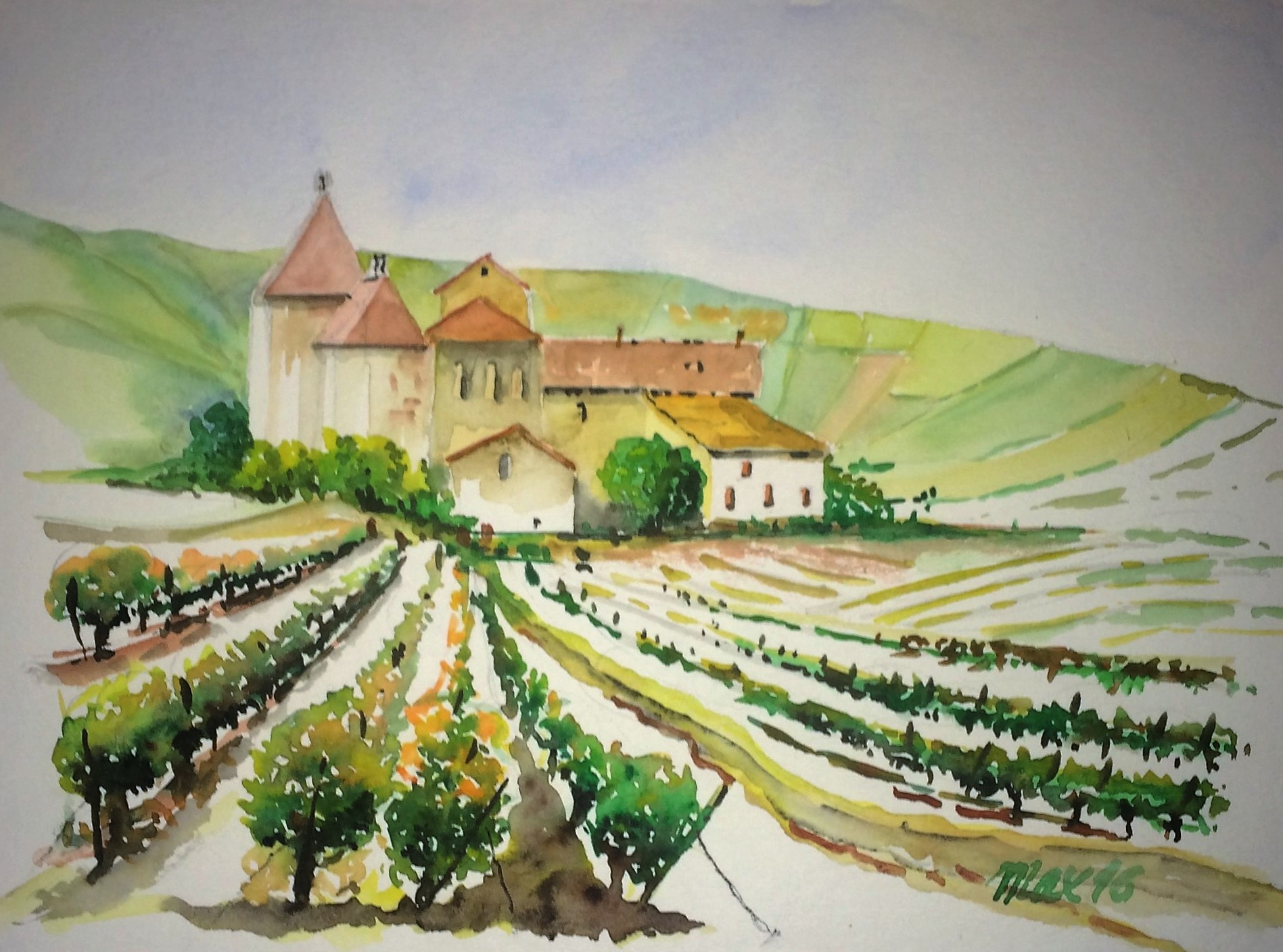 Pour faire cette esquisse, je prends deux cartes postales sans lien, l’une avec un château, l’autre avec de la vigne et je construits un paysage.