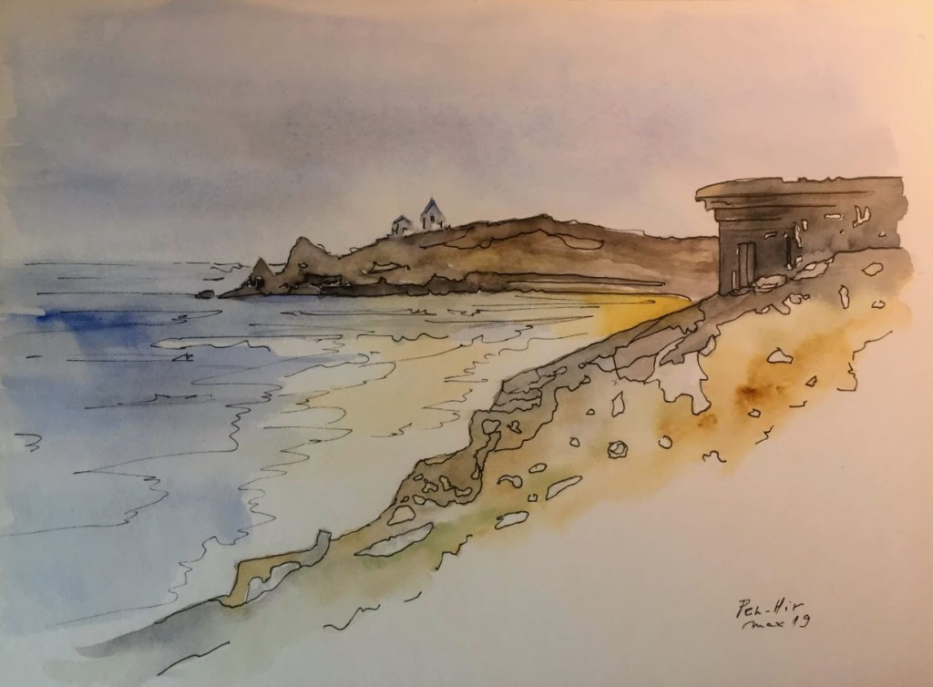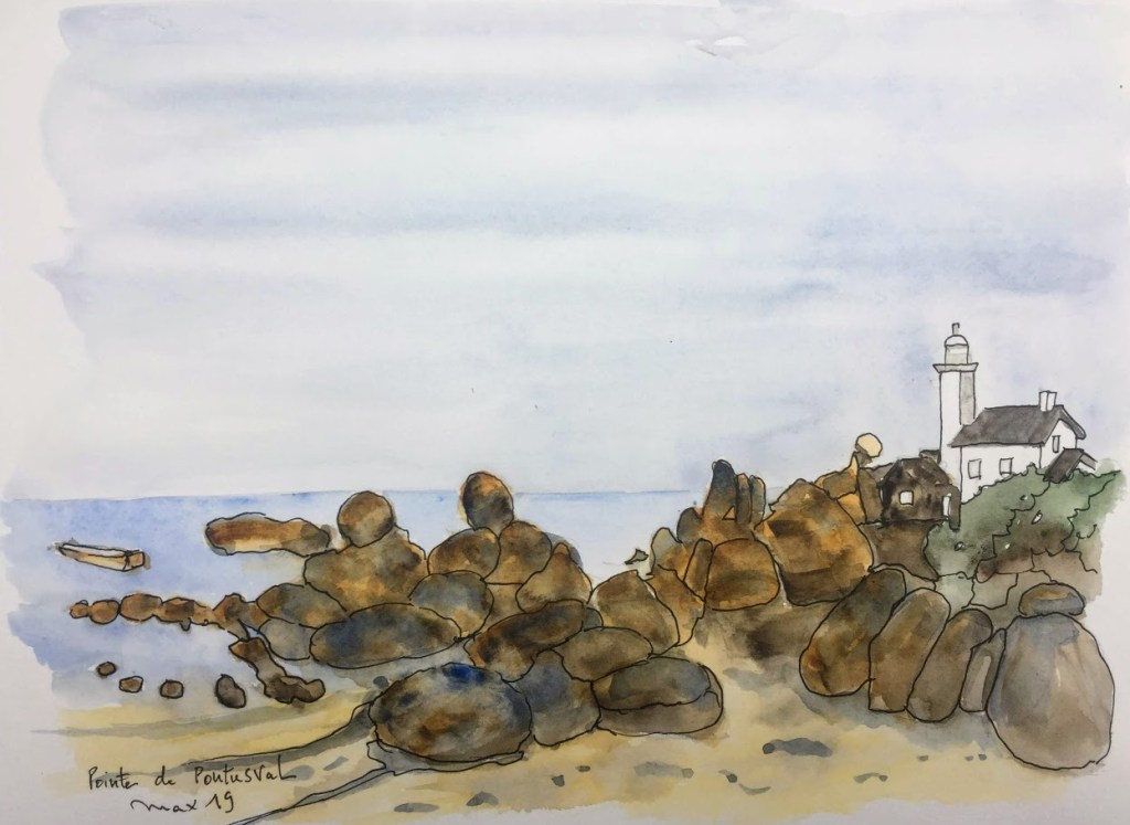 C’est pas beau, mais je publie quand même. Je n’ai rien fait depuis plusieurs mois et ce genre de texture bretonne est délicate. La côte rocheuse, le grès armoricain du coté de Camaret, est recouverte de végétaux aux coloris changeant et faire de l’écume à l’aquarelle n’est pas facile non plus. Vous avez les données du problème.