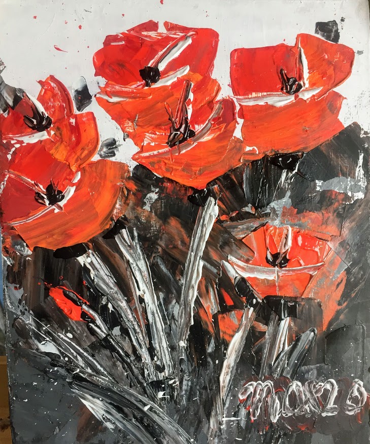 Je suis à couteaux tirés avec mes couteaux. Le medium acrylique est sympa à travailler. Mais les couteaux demandent un sacré coup de patte. D’autant que je suis gaucher, tous les tutos sur la toile sont à l’envers.
