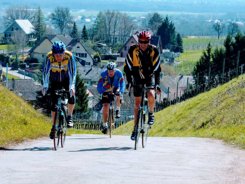 La montée du col Amic. Dans les Vosges.Un sujet maintes fois abordé.Et pourtant!C’était la première fois de l’année pour la plupart d’entre-nous.Un exercice toujours angoissant où l’on se demande si « ça va le faire » encore cette année…12 km de côtes avec 557 m de dénivelée.Fastoche pour les « gros mollets » mais toujours aussi impressionnant pour les rouleurs moyens peu entraînés.Bon, arrivés en haut, tout le monde est content.On s’attarde même à regarder la plaine d’Alsace depuis Kohlschlag.