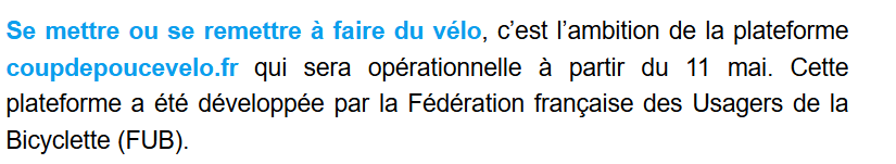 La FUB est très présente dans l’action en cours. C’est son rôle et elle semble bien le jouer. Elle a déjà fait dire au Conseil d’Etat qu rien n’interdisait de prendre son vélo pour faire le tour du quartier en étant confiné.
