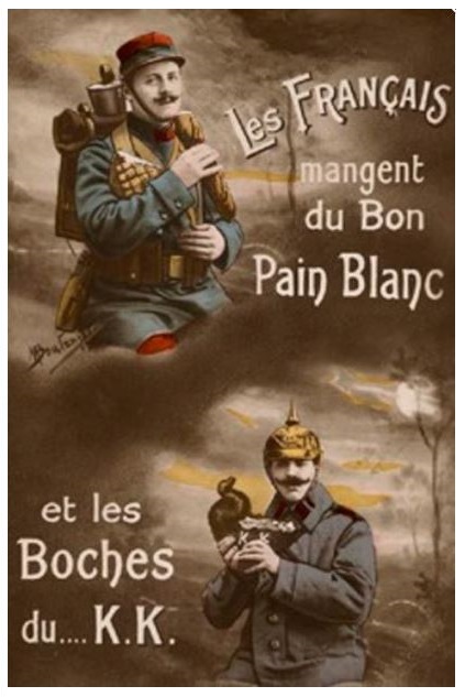 En 14, le pain KK était devenu célèbre et l’objet de raillerie. Nourriture de rationnement inventée par l’armée allemande le Kriegs Kartoffelbrot, pain à la pomme de terre, était à l’origine un pain à faible valeur nutritive composé de farine de froment, de seigle, et de pommes de terre. De la paille hachée pouvait également entrer dans sa composition.