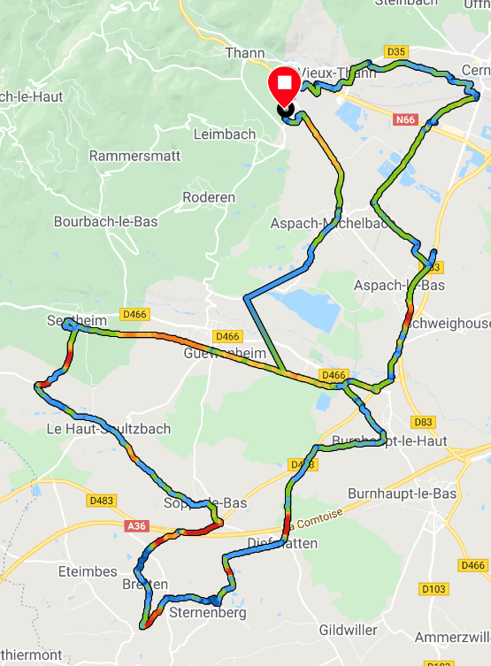 Les restitutions graphiques des GPS sont extraordinaires de précision. Bien que j’ai encore trouvé le moyen d’arrêter l’enregistrement entre Michelbach et la ZI de Burnhaupt et de me « voler » 5km. Le cardio a eu du mal à démarrer par manque de transpiration.
