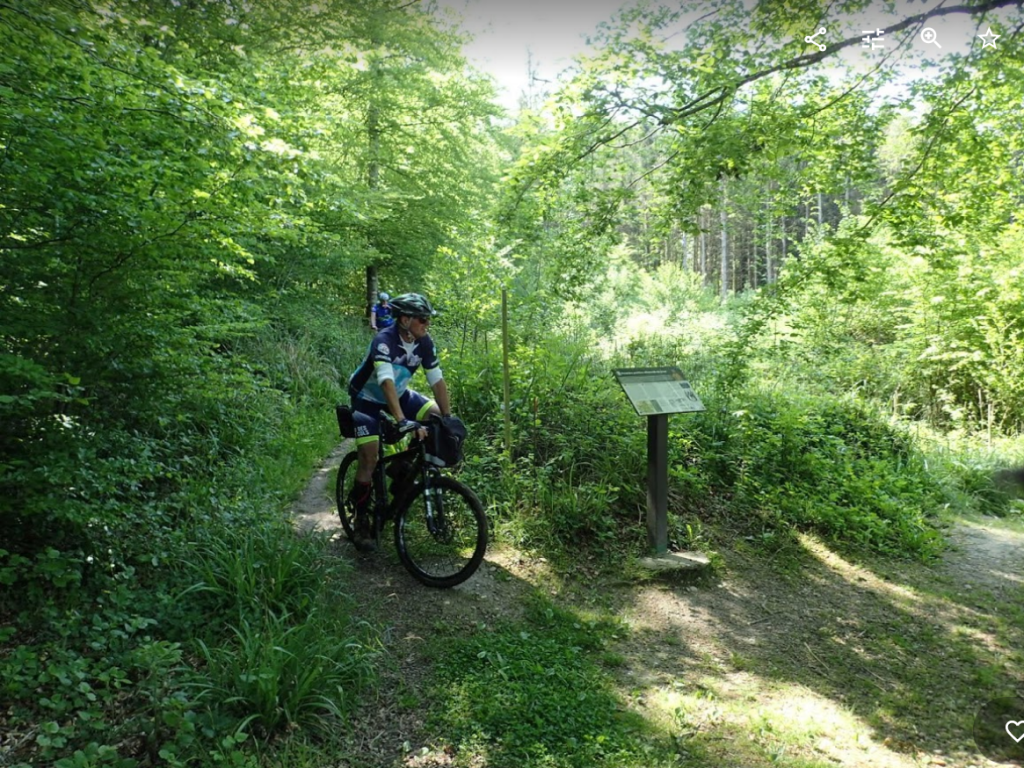 après une nuit réparatrice à l’auberge du Cerf à Winkel, nous sommes prêts à partir pour Sentheim toujours en longeant la frontière du départementdès le départ la terrible côte de Winkel…heureusement, pendant la montée une borne touristique relatant la barrière électrique installée en 14 par les Suisses pour empêcher le passage des frontaliers et des déserteursau carrefour des Ebourbettes, nous pouvons souffler un peula chapelle des Ebourbettes est magnifiquela ferme des Ebourbettes sur la frontière suisse a une histoire. elle a servi notamment à l’évasion du général Giraud. le petit bâtiment qui avait brûlé récemment au fond a été restauré grâce à Groupama nous a dit la fermière en allant voir si ses pommes de terre pointaient le bout du nez. si le chien ne nous aime pas c’est parce que des cyclistes lui ont donné des coups de pied…ce chien contrôle son territoire. Il est venu vers nous, a aboyé, puis a poursuivi son chemin.et après, où va t-on?on va droit au point de vue voir les ruines du château de Morimontc’est là, en bas, les ruines de Morimontpour monter au Roc du Corbeau, c’est gratiné!au Roc du Corbeau, vue sur le château plus préciseon quitte le massif dans une descente périlleuse qui nous amène à Levoncourt (km8)première position allemande de la frontière suisse jusqu’à Ostende en 14-18entrée de Pfetterhouse, nous voici sur du plat et l’on va prendre la piste cyclable jusqu’à Dannemarieun bitume salvateurétrange animal en équilibrepause à Wolfersdorf. on a fait 40km