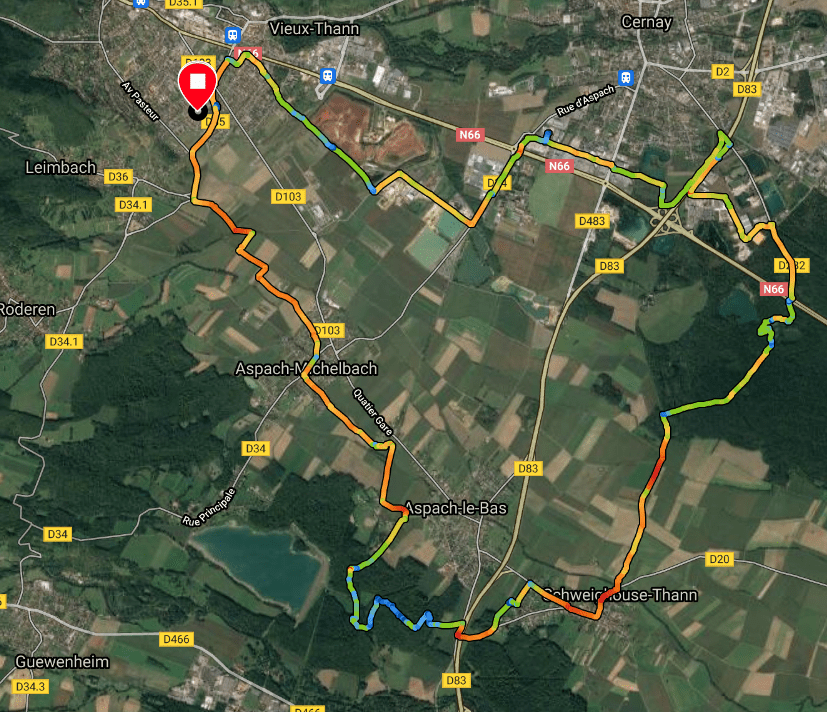 Je prends un parcours plat, je n’ai pas envie de grimper. Nous sommes trois pour cet itinéraire qui nous conduit jusqu’au plan d’eau de Reiningue.