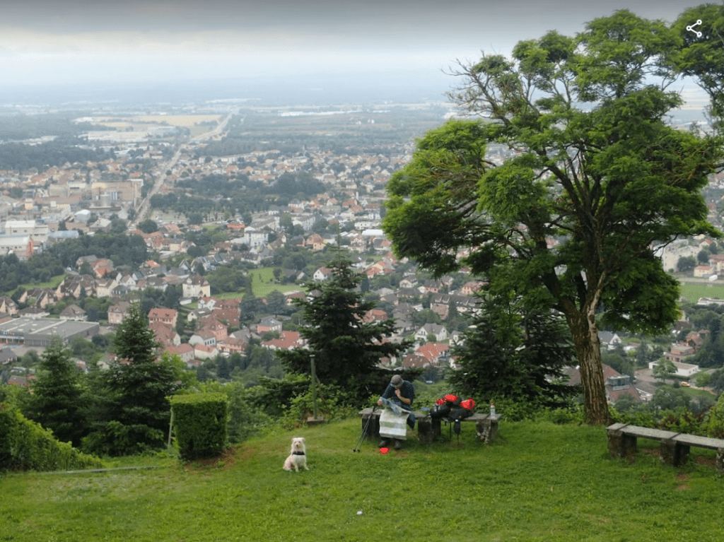 Le monsieur étudie son itinéraire devant la Croix toute neuve. Le chien patiente. Il vont à Belfort par le GR5 accompagnés de deux ados. Ce soir ils comptent bivouaquer au chalet du Rossberg….puis Ballon d’Alsace.
