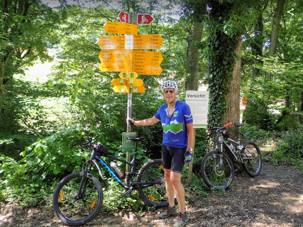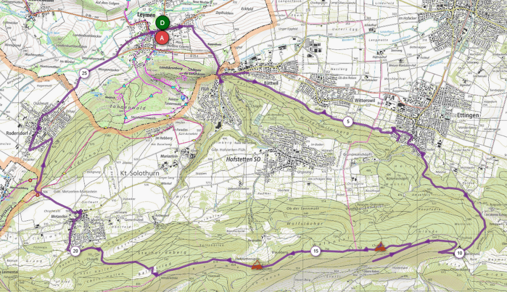 Partis de Leymen, on longe le tram, puis la forêt. A Ettingen au km 7 ça commence à grimper sévèrement. Je n’ai pas le fond de carte, je n’ai que la trace préparée. Pas facile de savoir si l’on est sur le meilleur itinéraire.