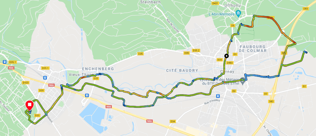 Aujourd’hui, deux couches sur les bras étaient limite face au vent glacial. Il va falloir se reporter sur les circuits VTT protégés, ceux de la forêt. Aujourd’hui j’ai tiré un arbuste qui barrait le chemin le long de la Thur sauvage. Tirer des arbres morts seul est parfois difficile. On devrait s’équiper d’une égoïne.