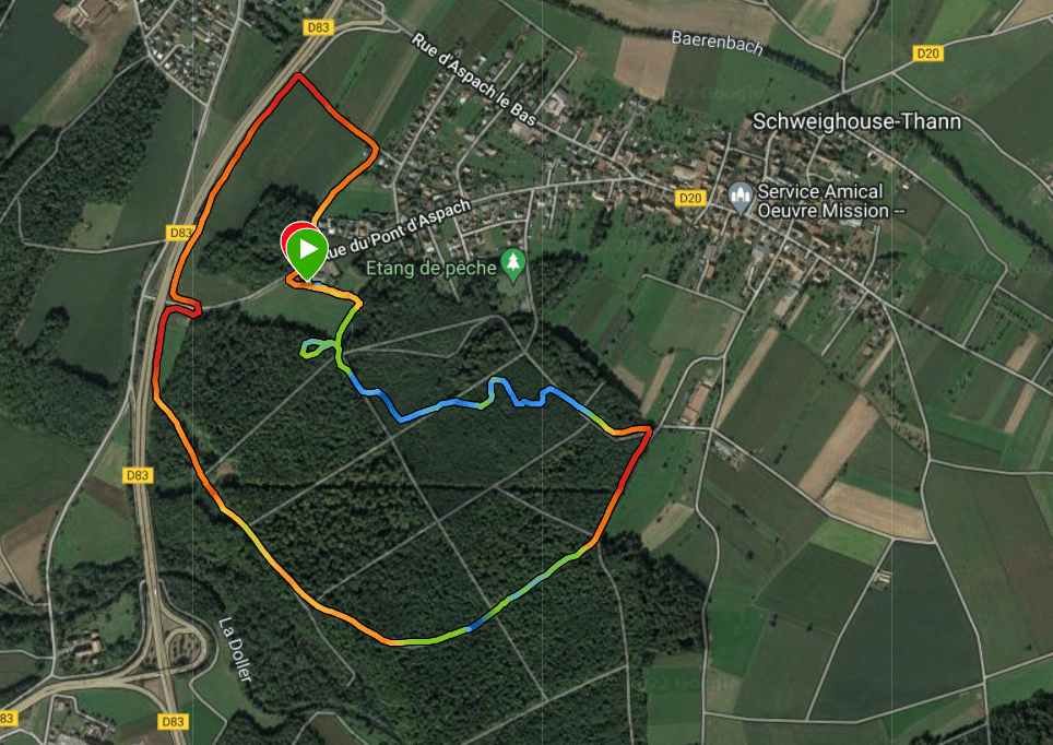 Un croissant pédestre à Schweighouse, montre au poignet. Cinq kilomètres en forêt. J’ai commencé par le parcours de santé, puis une boucle le long de la D83. Retour à la salle des fêtes.