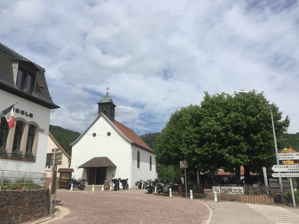 A Freundstein, j’allume les lampes clignotantes et j’enfile le coupe-vent. Excès de zèle penseront certains. Ben non, sous les frondaisons sans soleil, on fonce à toute blinde (locution adverbiale très usitée dans le milieu compétiteur) et on peine à distinguer le cyclo furtif venant en face. Il fait frais et le ciel s’est couvert. Les motos nombreuses me croisent dont un club de trike.