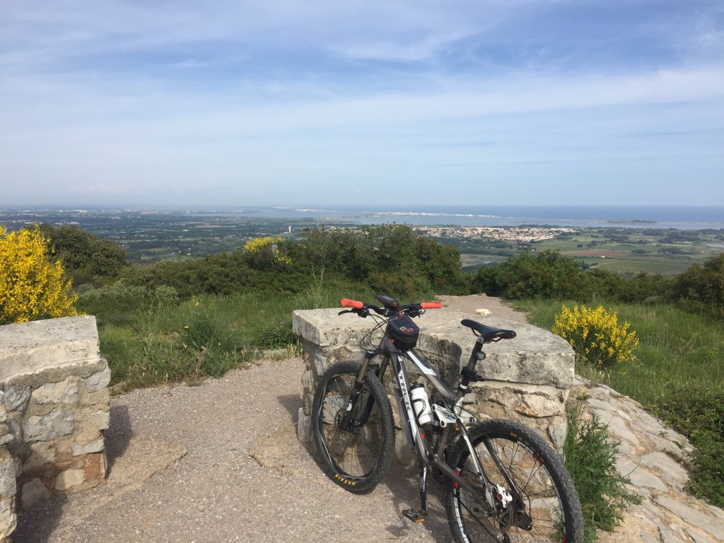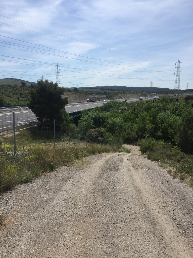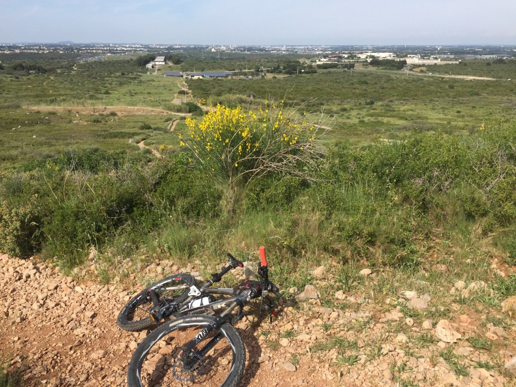 Sur le Mont Saint Baudile la vue sur le littoral est remarquable J’ai trouvé un chemin pour VTT au bout de 10km de routes, de rocades, de ronds-points accidentogènesJ’ai plongé pour traverser la Languedocienne en peine perdue car en bas j’ai eu un cours d’eau infranchissable Les dessous de l’autoroute propices à un monde interlopeAprès mes soucis de pneus j’ai grimpé le mont en commençant par le site muletier qui abrite le refuge de la SPA. Les animateurs y promènent leurs chiens en laisse. ce n’est pas plat comme l’image le laisse croire