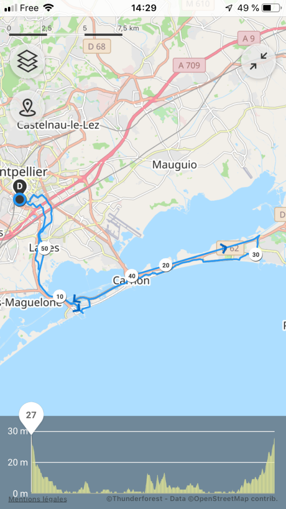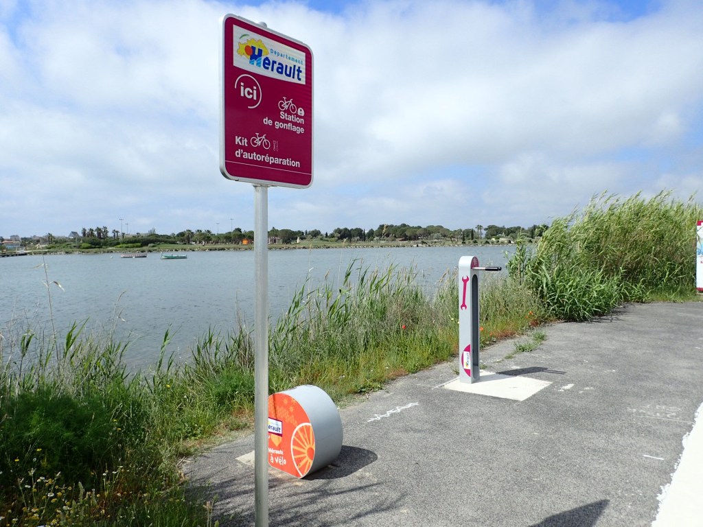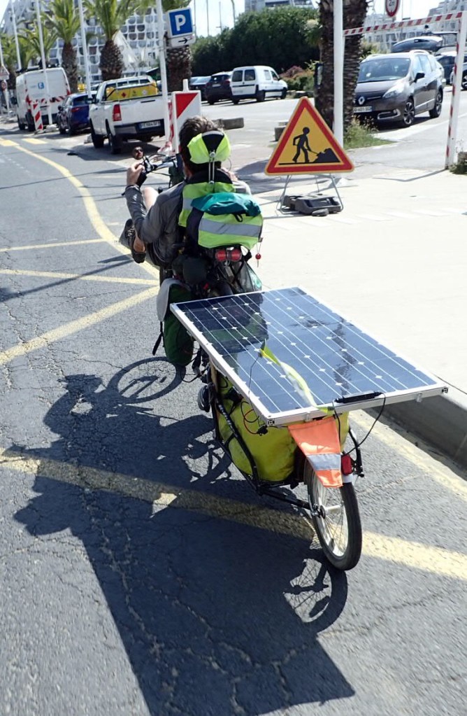 Carnon-La Grande Motte par le canal. Interminable !Ma seule rencontre La Grande MotteL’architecture futuriste des années 70Des voyageurs solairesCharge le matin, après-midi coolJe rentre à Carnon par le Grand Travers où la piste est magnifique Halte à Palavas à la station de dépannage vélo Je teste. Trois tournevis et une clé plate de 14Pompe à pied en état de marcheLe port de Lattes attend la montée des eaux car le Lez est incapable de remplir l’écluse avec ses 2m3/secondeArrivée à Montpellier viaduc TGVSous l’autoroute Bientôt la grande métropole et son infernal trafic routier. Les cyclistes se défendent bien et sont agiles. Ils sont aidés par les trottinetteurs de plus en plus nombreux à prendre le contrôle de la ville