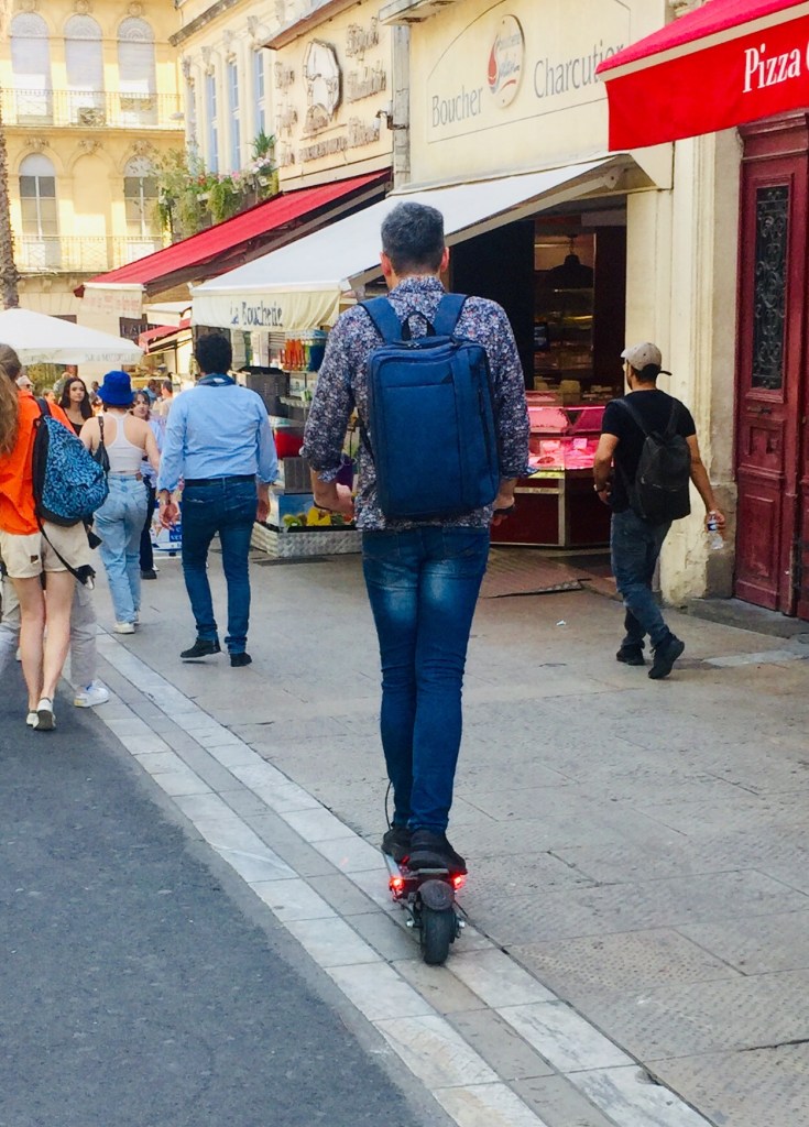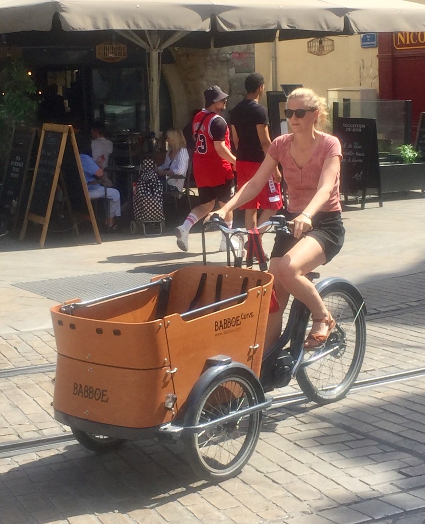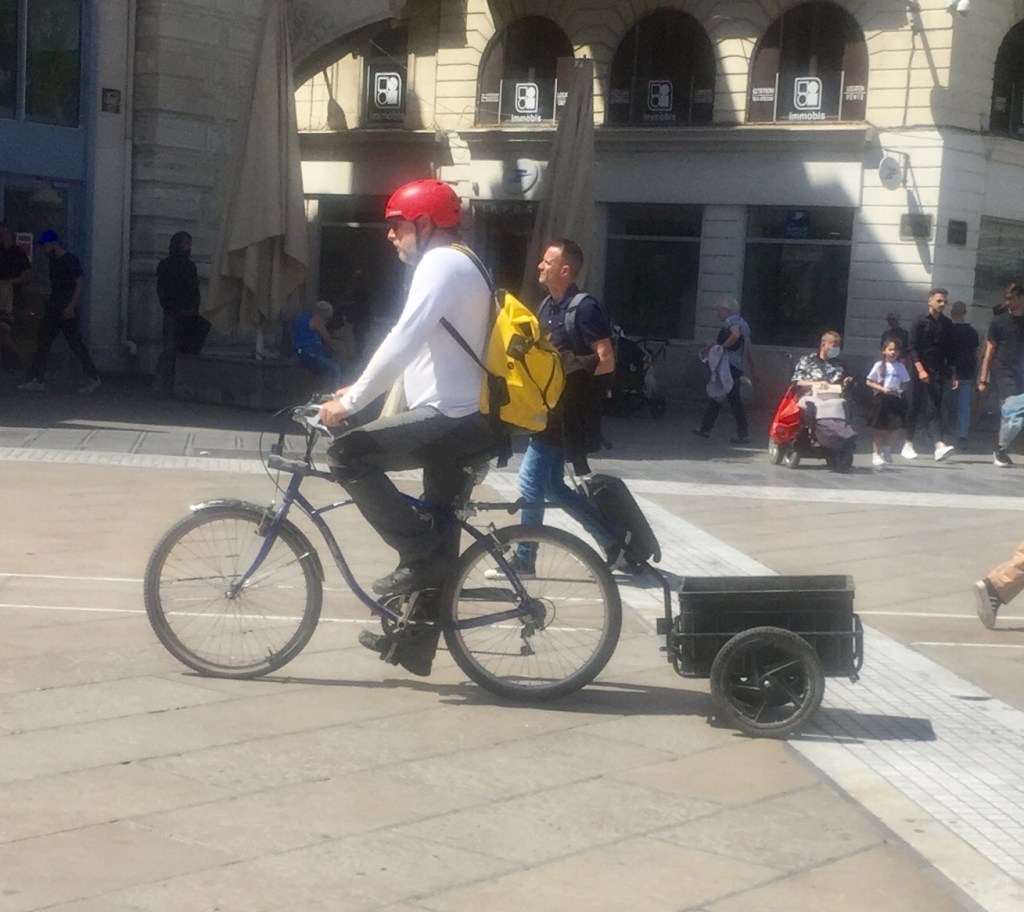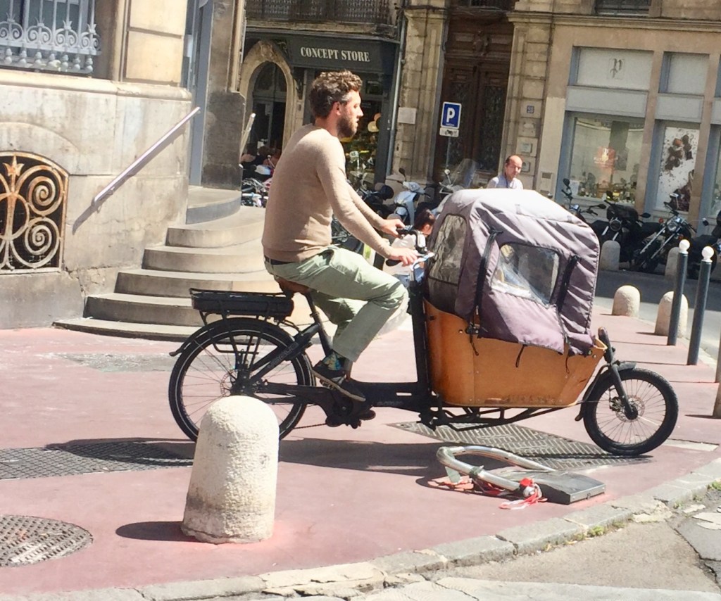 Je n’ai pas l’expérience du vélo en grande agglomération (500.000 habitants). Je peux donc faire un rapport d’étonnement sans arrière-pensée. On s’en doute, je suis conquis. Pourquoi? Parce que l’image ringarde du vélo en province est rayée d’un trait. Dans « l’autre France », le vélo a pris sa place, mais ne soyons pas jaloux, la trottinette électrique emporte la palme, c’est un nouveau phénomène de société. L’engin est simple à mettre en œuvre, facile d’usage, moins impliquant qu’un vélo pour se faufiler en zone dense, faible apprentissage, facile à emporter avec soi en mode piéton jusqu’à l’intérieur de sa destination. L’autre phénomène, c’est celui de l’incursion du vélo cargo dans le cœur de ville : vélo taxi, vélo excursion, vélo course et livraison. Place aux images.
