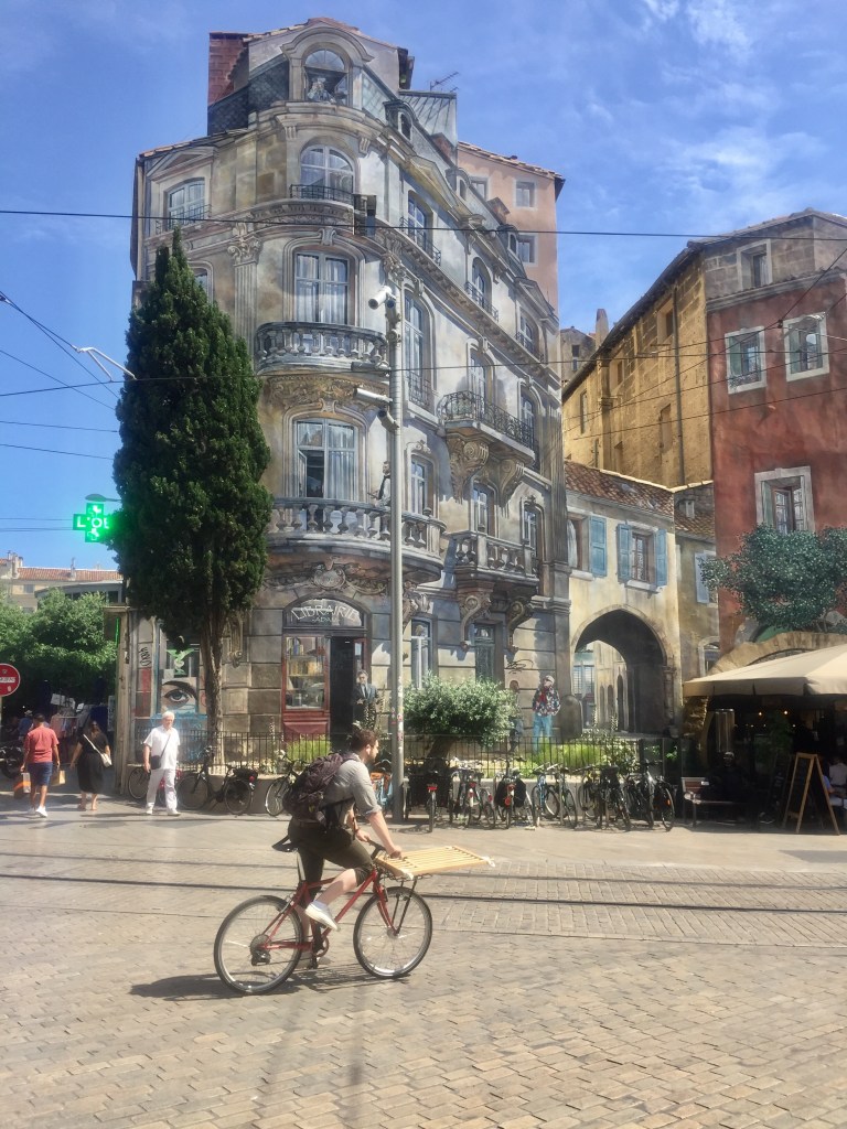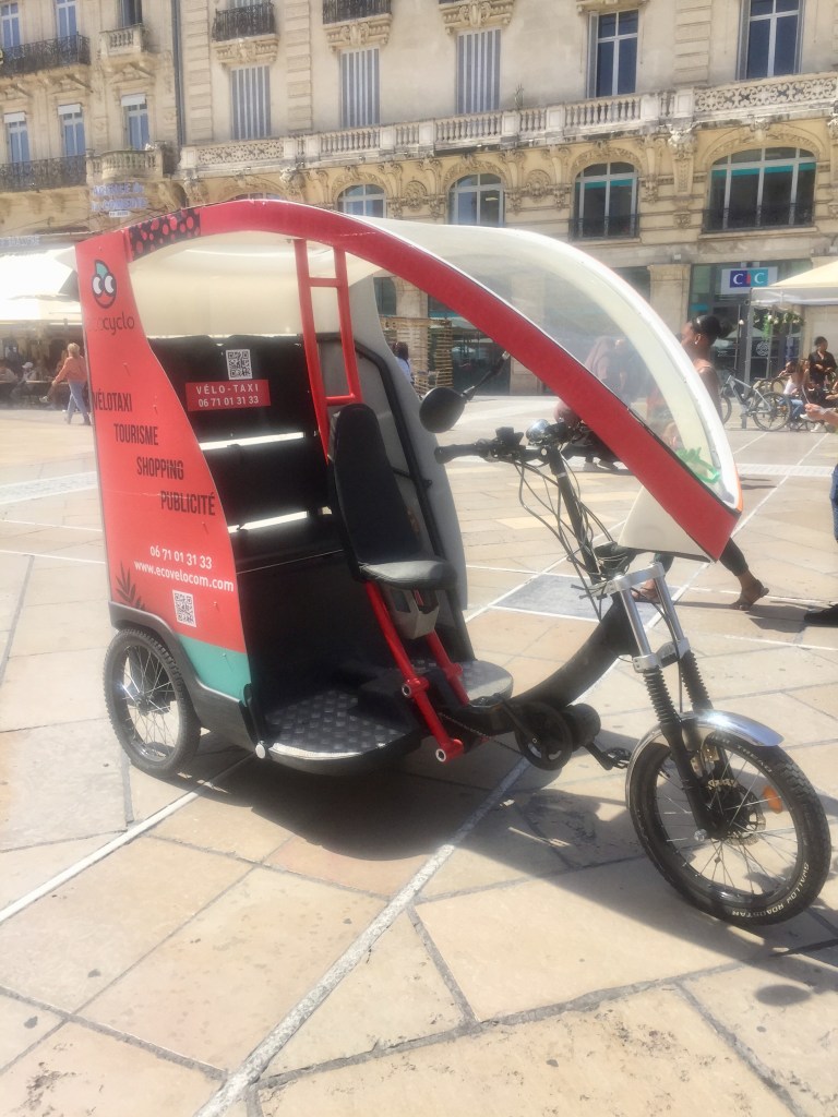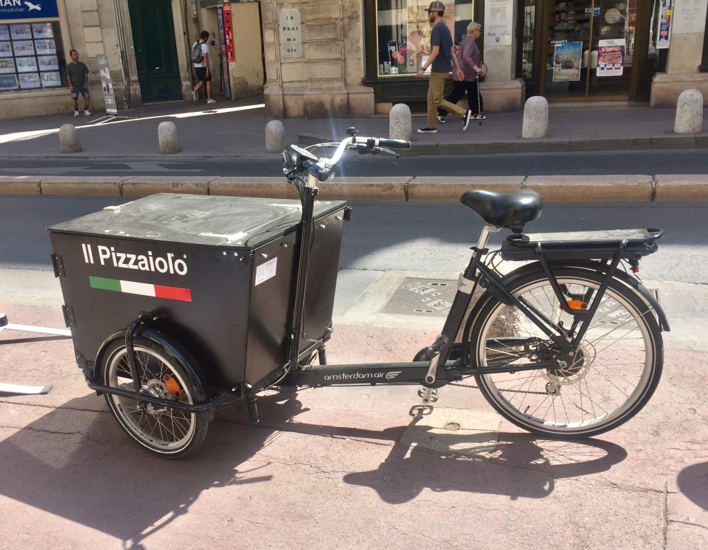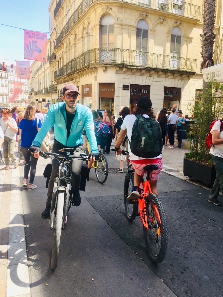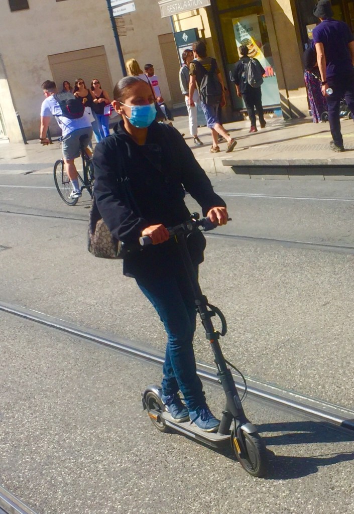 Je n’ai pas l’expérience du vélo en grande agglomération (500.000 habitants). Je peux donc faire un rapport d’étonnement sans arrière-pensée. On s’en doute, je suis conquis. Pourquoi? Parce que l’image ringarde du vélo en province est rayée d’un trait. Dans « l’autre France », le vélo a pris sa place, mais ne soyons pas jaloux, la trottinette électrique emporte la palme, c’est un nouveau phénomène de société. L’engin est simple à mettre en œuvre, facile d’usage, moins impliquant qu’un vélo pour se faufiler en zone dense, faible apprentissage, facile à emporter avec soi en mode piéton jusqu’à l’intérieur de sa destination. L’autre phénomène, c’est celui de l’incursion du vélo cargo dans le cœur de ville : vélo taxi, vélo excursion, vélo course et livraison. Place aux images.