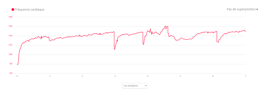 enregistrement du rythme cardiaque sur mes 7 km. ne pas se faire violence. rythme moyen 140 Pls/s