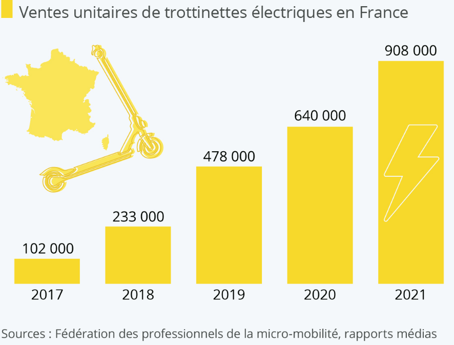 Cependant en dépit de cet acte imbécile d’Extinction-Rébellion (qui se garde au passage d’évoquer le vélo à assistance électrique qui, lui, serait plus vertueux?) le marché de la trottinette continue de prospérer. Je n’invente rien: en 2021, 908 000 trottinettes électriques ont été vendues dans l’Hexagone, contre 640 000 l’année précédente, soit un chiffre en hausse de 42 %. il s’est vendu environ 2,7 millions de vélos en 2020, dont 510 000 à assistance électrique. (source)