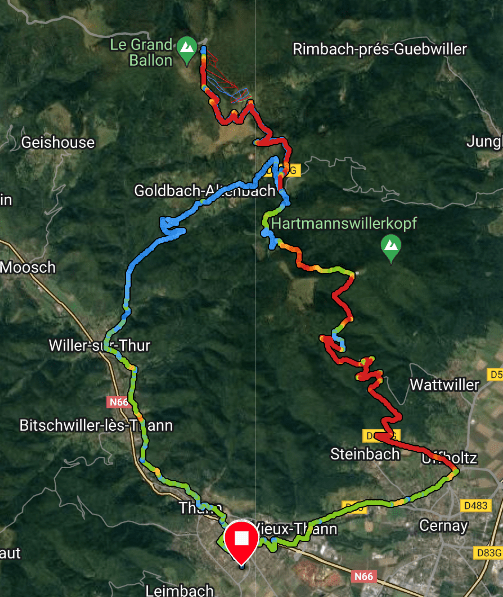A la Fourmi l’excitation est à son terme, on plonge jusqu’à atteindre 75km/h dans la descente, histoire de gommer mes patins neufs, on fonce sur la voie verte jusqu’à Vieux-Thann. Avec une incorrection totale vis à vis des promeneurs en ce dimanche matin.