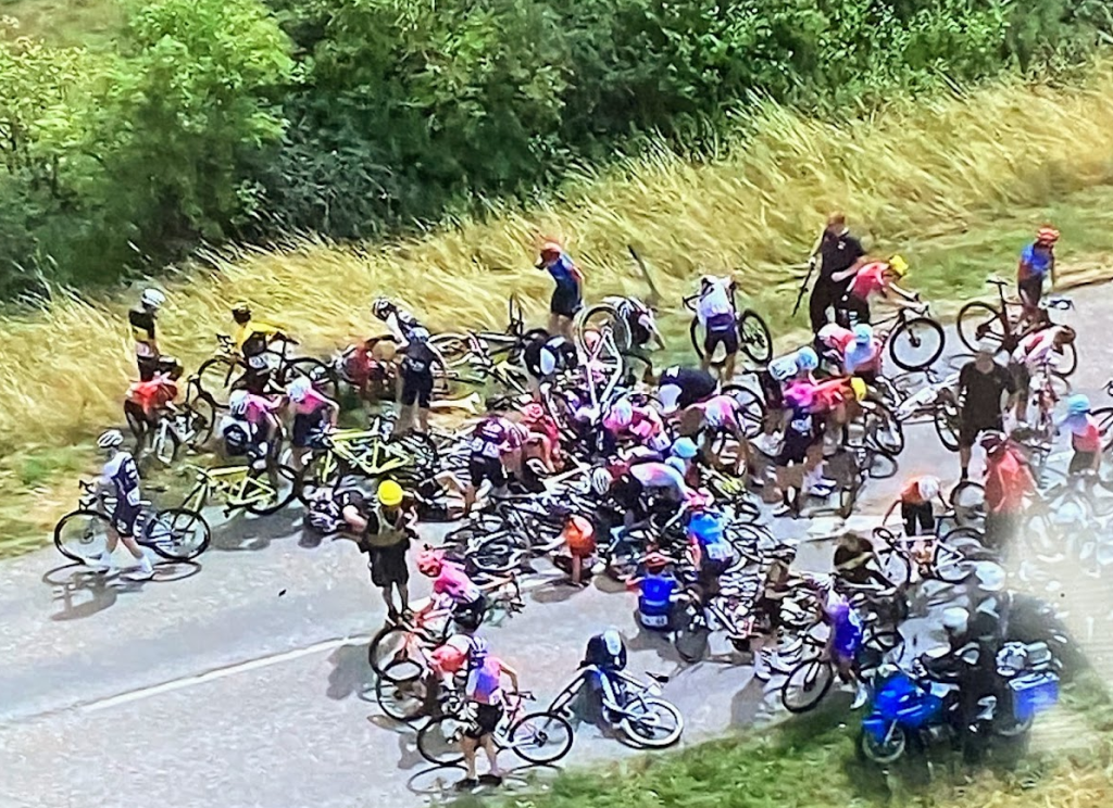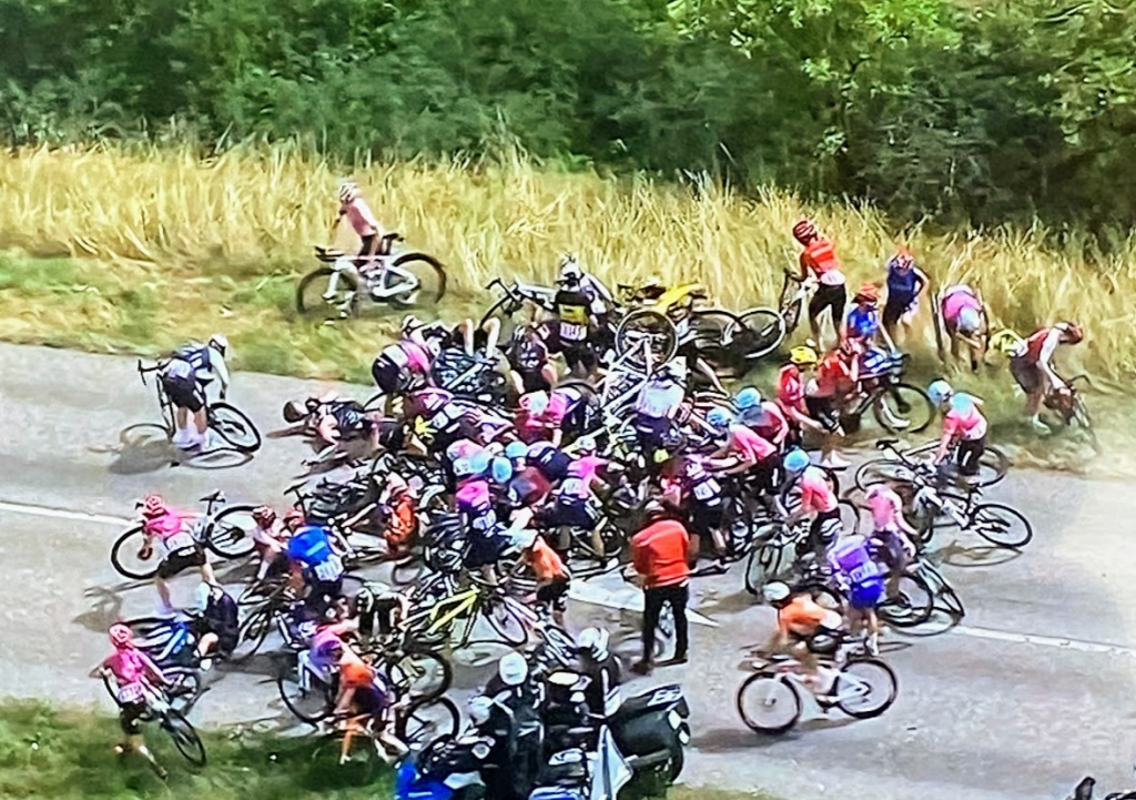 Donc dans ce Tour du Quart de France , que voit-on? des chutes en cascade de femmes à vélo parfaitement filmées depuis des hélicoptères et des motos. On en arrive à se demander si ces cascades à vélos ne sont pas programmées pour amuser la galerie. Notez bien que des cascades de chutes chez les hommes, il y en a aussi. Donc n’incriminons pas le sexe faible.