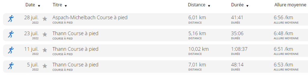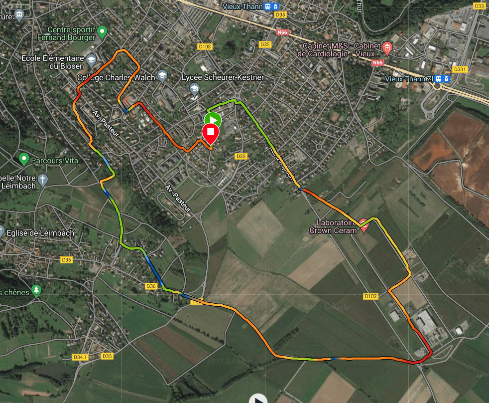 Il faut m’ingénier à trouver un itinéraire plat qui évite la route et les grimpées qui me sont inaccessibles sur le plan cardiaque. Sauf à marcher. Guidé par un score? un peu mais avec modestie. Je sais courir 10 km et c’est donc un repère dans l’élaboration de mon circuit. Aujourd’hui, je dois monter à Leimbach en fin de parcours. Une épreuve! Je finis par marcher rue des Vignes. Et je reprends une fois arrivé sur les hauteurs.