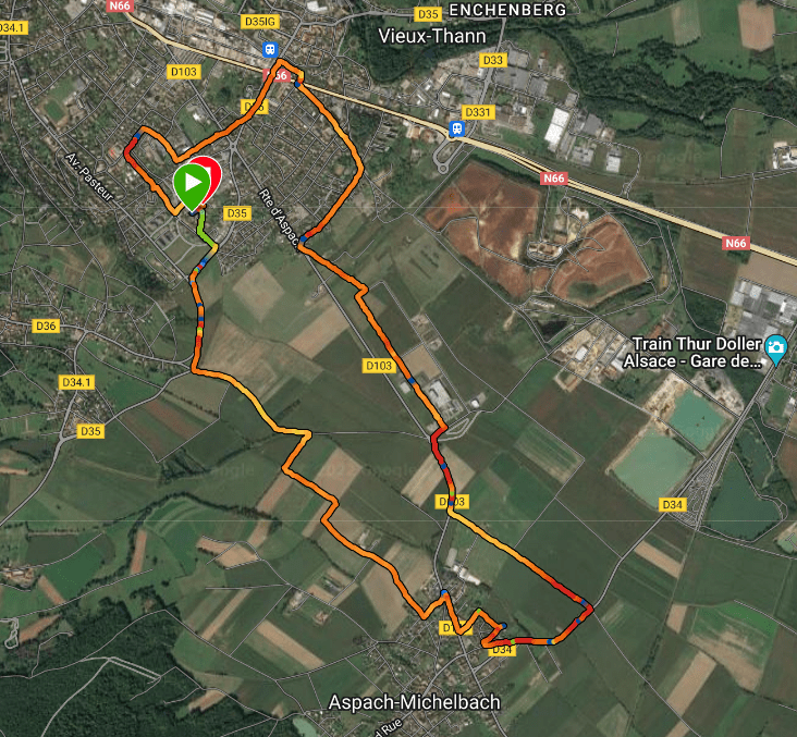 Puis on prend Schweighouse-Reiningue, Wittelsheim. Je traverse Wittelsheim à 35/40…il est déjà midi. Je vais être en retard à l’apéro, dirait l’autre.
