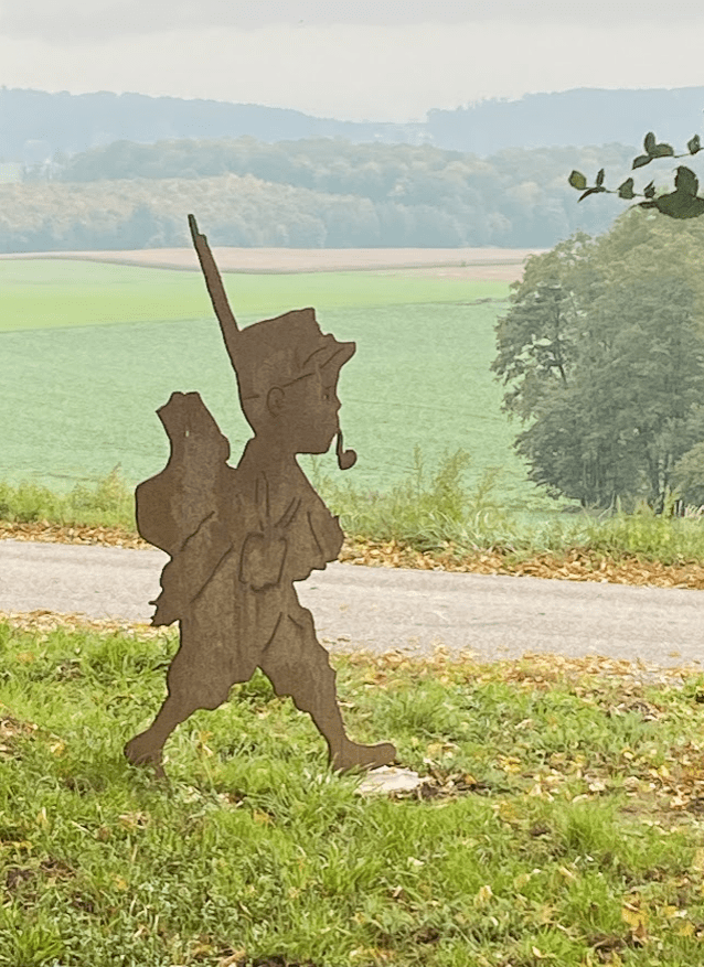 Puis je trace une longue ligne droite que je redoute ennuyeuse. Non. Car tous les cinq cents mètres j’ai une évocation illustrée d’Oscar Sorre. Un conte d’autrefois et son histoire sous forme d’épisodes à chaque halte.