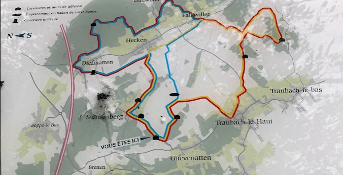 Nous vous conseillons également de visiter les casemates les plus remarquables du secteur, situées sur les bans de Bréchaumont et Manspach. Les pupitres de nos circuits de mémoire vous livrent quelques informations historiques mais aussi des messages envoyés par les soldats engagés sur ce front à leurs familles. Ligne de front stabilisée fin 1914 Seconde ligne française, fortifiée à partir de 1915 Ce dispositif fut constamment renforcé avec l’apparition des tôles circulaires dites Métro créés par les usines Japy et que les cimentiers du Génie utilisèrent pour coffrer les casemates de forme circulaire. A la fin du conflit sur cette seconde ligne reliant Pfetterhouse à Dannemarie puis à Guevenheim, ce sont plus de 80 ouvrages bétonnés qui ont été recensés. Le circuit jaune, de ce sentier de mémoire vous permet d’en découvrir sept. Les français érigèrent même une 3º ligne de blockhaus sur les hauts de Bréchaumont-Bellemagny Éteimbes.
