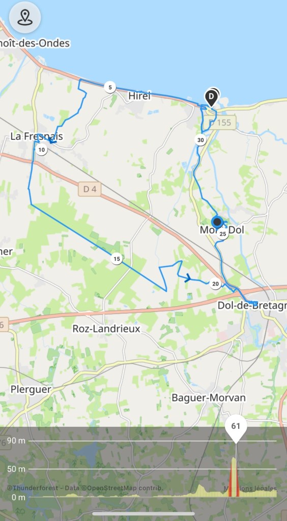 Puis j’envisage le retour, mais je vois indiqué le Mont Dol. J’y vais. Ça grimpe sec la montée du mont. Du 15 à 20%.