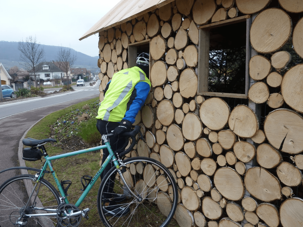 Sur cet itinéraire, il y a deux passages à 9%. L’un avant le moulin et l’autre après Goldbach. Je roule à 7/8 km/h avec ces pentes. C’est lent mais je fatigue moins.