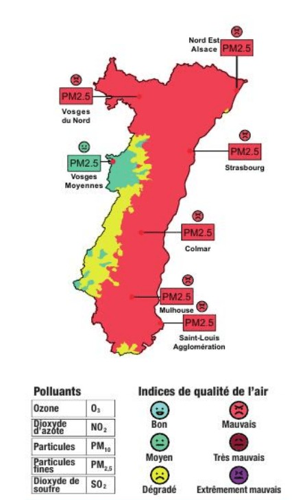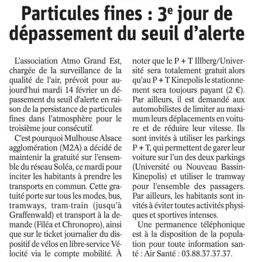Les Alsaciens sont fatalistes, ils s’accommodent des particules fines depuis longtemps. En Alsace, il n’existe pas de mouvement dissuasif pour contrer les périodes de pollution. Les particules sont tellement fines qu’on peut douter de leur existence puisqu’on ne les voit pas.