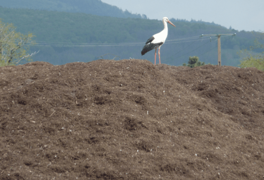 Un cigogne sur un tas de bio-déchets au SM4 d’Aspach