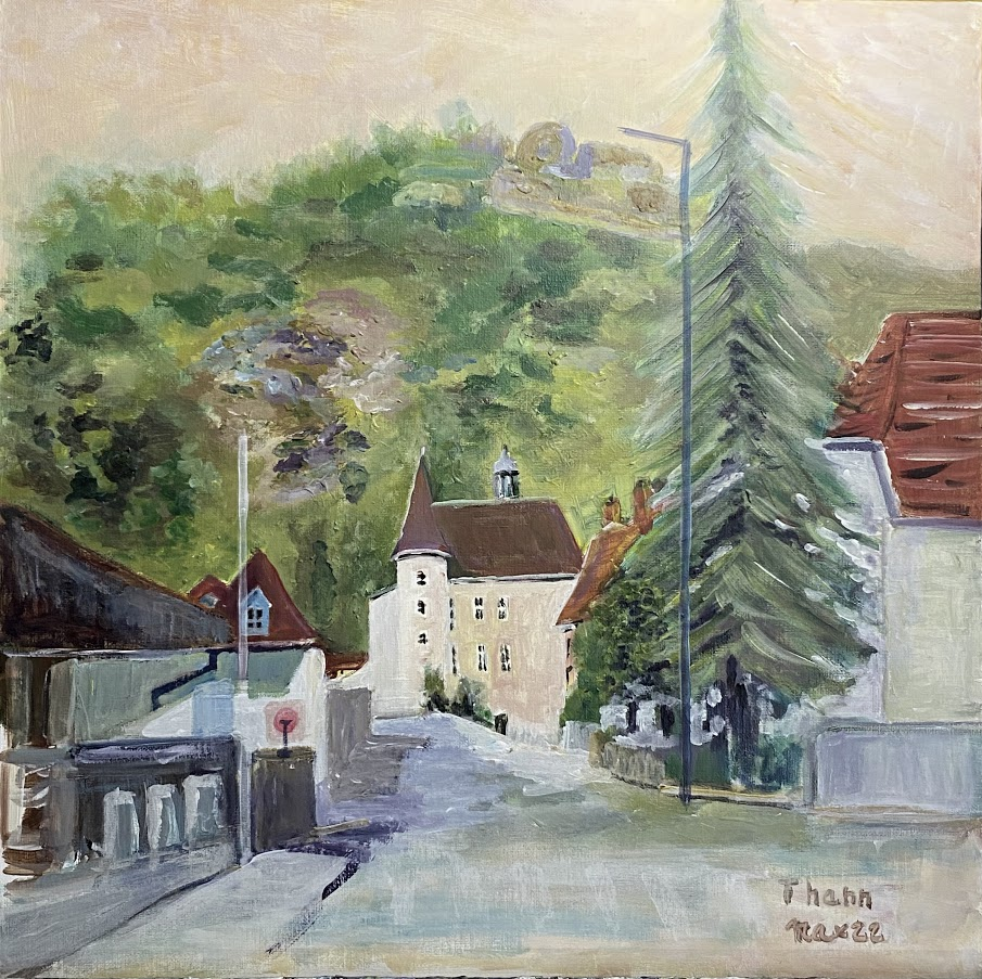 Puis le cheminement de l’œil doit prendre la rivière pour voyager dans le tableau jusqu’à la Tour des Sorcières avec son bonnet rond.