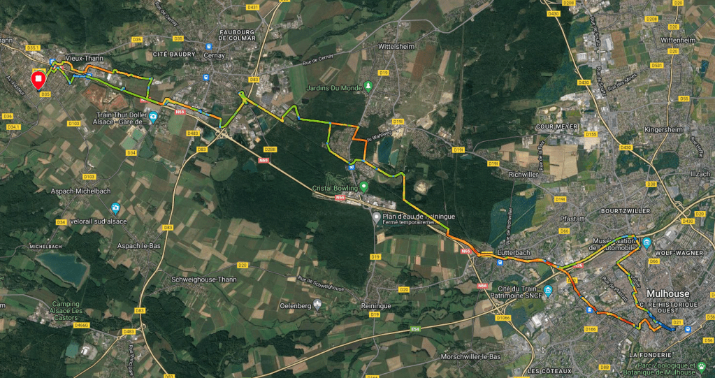 Aujourd’hui, j’ai fait au plus court pour rejoindre Mulhouse à VTT. Tout juste 50km aller et retour.