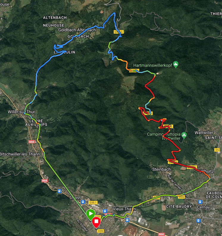 C’est à Bitschwiller que je m’aperçois que j’ai arrêté le gps par erreur . Il tracera un ligne droite depuis le départ et donc 5km non enregistré