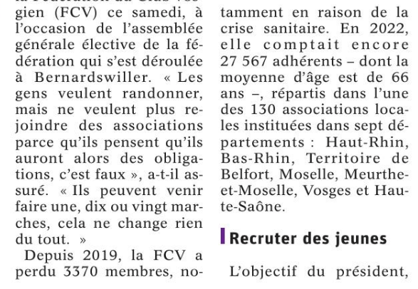 Ce n’est pas réjouissant comme nouvelle. Les marcheurs affiliés au Club Vosgien régressent. Dans un article des DNA (05/06) on y apprend que le club a perdu 3370 membres en quatre années.