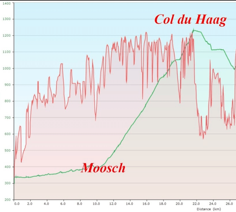 Ce sera donc l’option 3, le col du Schirm. Finalement, je renâcle un peu dans les passages à 7/8%, mais après la bifurcation de la colo, il n’y a plus très long avant d’atteindre le Schirm à 604m. Je n’ose plus regarder le cardio avec mon surpoids endémique. Maxi 165 un court instant. Mais quand même.
