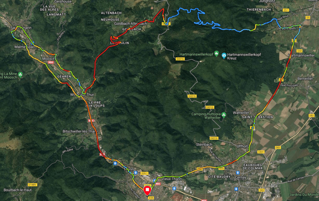 J’y ai mis du cœur. Mais il ne suffit plus. Lorsque ça flingue devant moi, je m’accroche comme je peux. Mais au-delà de 40 km/h je décroche car mon cardio explose. Et pourtant la route de Morzwiller descend ! Bon, je le reconnais ces mouvements d’accordéon en groupe ne sont plus de mon âge.