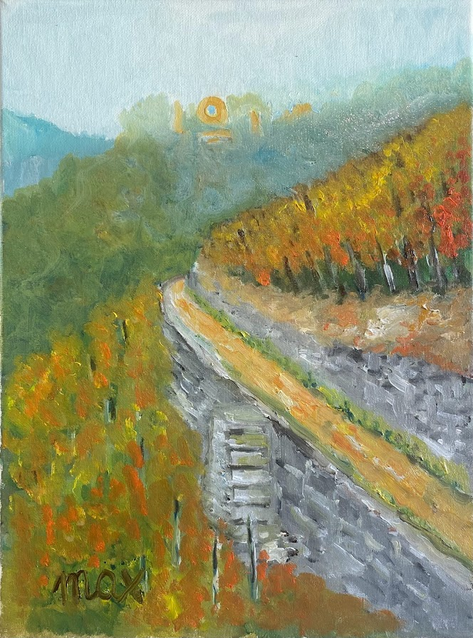 En plein soleil, le travail est plaisant, mais une fois à l’intérieur mes couleurs apparaissent ternes. Alors je redonne de la lumière et je force un peu sur les feuillages d’automne du vignoble.