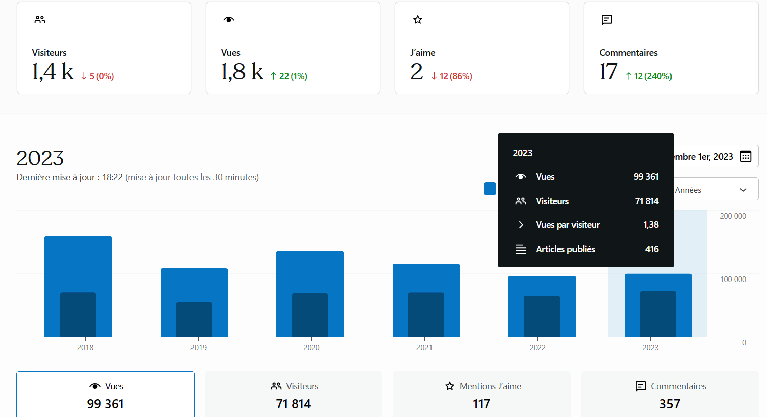 Mais il est vrai que j’ai produit cette année là en 2018 619 articles et seulement 416 en ce début décembre. 2023 n’est pas encore terminé, j’ai donc un joker pour mieux faire.