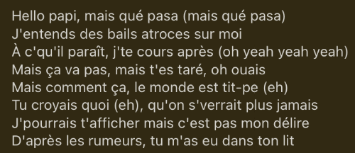 Hello papi, mais qué pasa (mais qué pasa) J’entends des bails atroces sur moi À c’qu’il paraît, j’te cours après (oh yeah yeah yeah) Mais ça va pas, mais t’es taré, oh ouais Mais comment ça, le monde est tit-pe (eh) Tu croyais quoi (eh), qu’on s’verrait plus jamais J’pourrais t’afficher mais c’est pas mon délire D’après les rumeurs, tu m’as eu dans ton lit
