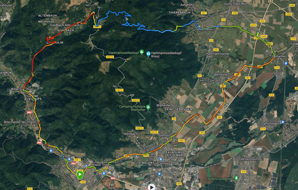 Il se trouve que je ne vais plus par là depuis que j’ai quitté Mulhouse. J’y suis retourné néanmoins en avril 2022 (voir ci-dessous « Presque vrai ») depuis Thann mais j’avais 125 km au compteur. C’est trop pour moi à présent. Je ne me permets ces distances qu’à cyclo-camping.