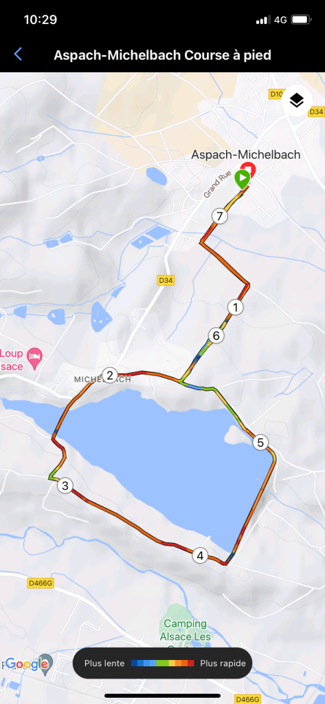 Plus vite que d’habitude en tentant d’améliorer ma foulée, plus longue (1m aujourd’hui), moins saccadée. Il me faudrait un coatche car je ne vois pas ce que je fais.
