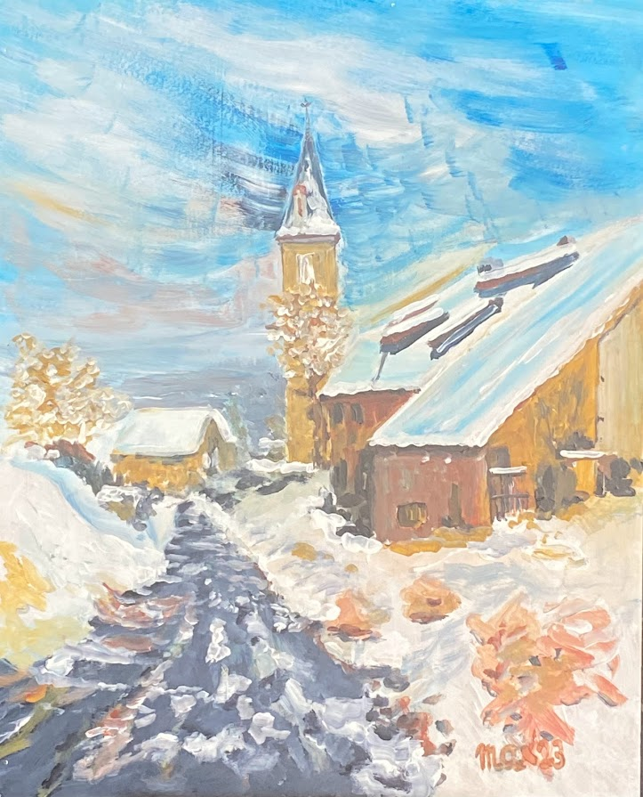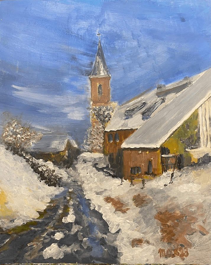 Sur ce fond d’armoire en contreplaqué, j’avais peint Leimbach alors qu’il y a avait de la neige.