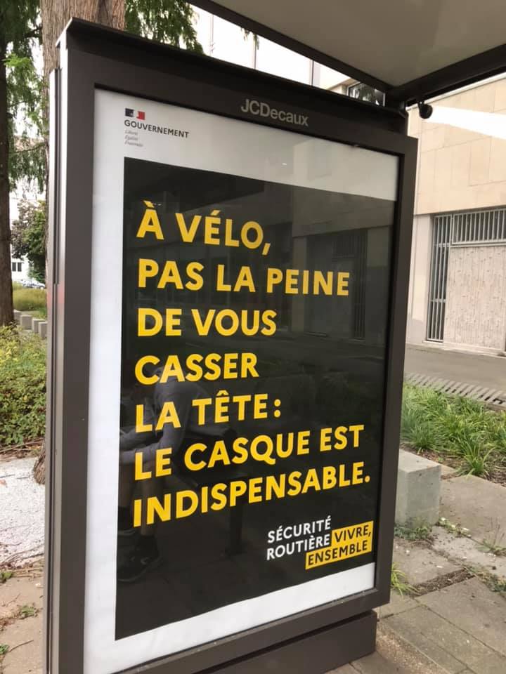 En privilégiant une communication anxiogène qui aura pour effet de dissuader nombre de ceux qui hésitent à quitter leur voiture pour faire 3 ou 4 kilomètres en ville, la Sécurité Routière prend le parti des automobilistes. En Australie, l’imposition du casque a fait baisser la part modale du vélo de 30%. C’est plus facile de pénaliser le vélo que de construire des ouvrages sécurisés et dédiés. On ne sortira jamais de ce dilemme culturel qui cherche à tous prix à favoriser la bagnole et les SUV, cette hérésie environnementale qui fait que plus aucun constructeur n’a autre chose à proposer dans ses catalogues.