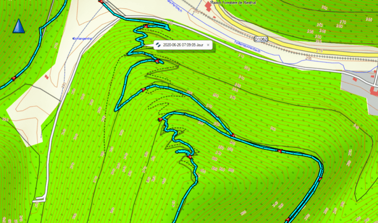 Montée au col de l’Ungerthal. Les marcheurs ont inventé la trace zigzag passant de la cote 215 à la cote 460. Je pousse comme je peux mon vélo…et je ne croise aucun marcheur ni cycliste