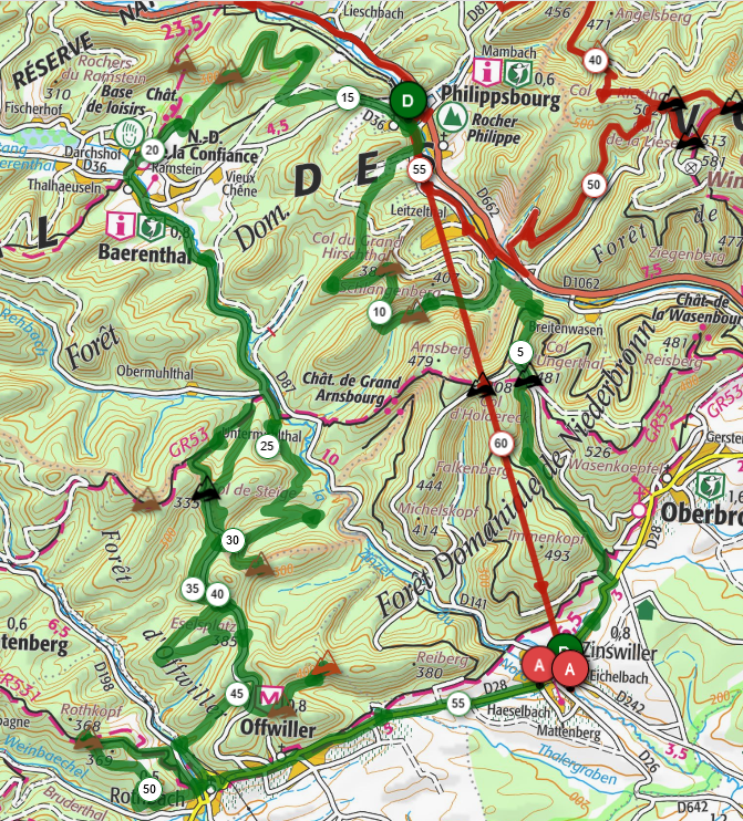 Après avoir quitté Zinswiller, j’aborde Offwiller par la route, puis je grimpeJe tente parfois de couper au plus court, mais je ne suis pas toujours gagnant. Achrrrr!Et voila le col! Nul panneau, juste une pierre qu’un aimable confrère aura peut-être déposé là en guise de sépulture? je tourne autour…j’actionne la recherche de waypoint...ça faisait longtemps que je n’avais pas crevé. A VTT, le pneu est vite à plat si la fuite est importante. Je regonfle avec une bombe qui en principe étanchéifie la fuite. Mais ici ce n’est pas gagné, le liquide sort en gros boudin. Je mets mon doigt dessus…la fuite se colmate. Pas longtemps! après 100 mètres nouvelle éruption! Puis c’est le calme. J’ai encore assez de pression pour rentrer. Je suis un inconditionnel des pneus sans chambre (comme pour les voitures). A VTT, le « sans chambre » doit toujours comporter un liquide d’étanchéité à l’intérieur du pneu. En dernière ressource si l’entaille est trop large, il faut démonter, mettre une chambre après avoir retiré toutes les épines accumulées et gonfler…en priant. Il existe aussi des bouchons de pneusquand je ne vois ce qui m’attend dans la grimpée, le GPS me dévoile tout. Tous les 100 mètres à pousser le vélo, je m’arrête pour souffler et je regarde mon écran et quand le cardio est redescendu à 100 pulsations, je redémarre. Ici c’est la montée à l’Ungerthal qui est redoutable pour moi. A chaque épingle je porte l’arrière pour le remettre dans l’axe et vu l’étroitesse du sentier, je me méfie de ne pas cogner le tibia dans la pédale Zinswiller et sa petite mairie marque le terme de mon périple de trois jours dans les Vosges du nord.