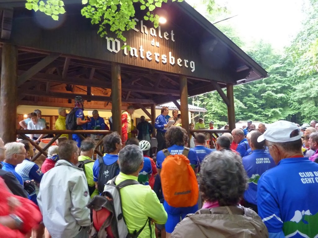 Au col du Pigeonnier, une statue de randonneur édifiée en 2012 (sculpteur Adrien Meneau) la carte et la boussole autour du cou et la baguette de pain qui dépasse du sac à dos Me voici au premier col, Birkenthal. Un peu fébrile à l’idée de ce qui m’attend La qualité de la signalétique est irréprochable, comme à l’accoutumée. Mais pour un cycliste, la somme d’informations glanées à la fin de la journée me donne le tournis. Pas de doute: nous sommes dans une région de marcheurs passionnés.J’ai oublié de le préciser, les Vosges du nord, c’est de la forêt, rien que de la forêt. Et les chemins sont rarement pierrés, il sont souvent sablonneux. Dans les descentes, à vélo, il faut y prendre garde car certains endroits ressemblent à des bunkers de golf: si vous plongez dedans, vous prenez une belle gamelleA Climbach, il y a deux ou trois belles demeures alsaciennes. Celle qui est devant nous à gauche date de 1821. Elle a la particularité d’avoir des fenêtres à verre bombé (lire ici les détails de ce verre bombé) Les cols vosgiens sont tous signalés au moyen de ce rond blanc à liseré vert. C’est notre juge de paix pour savoir on est passé au bon endroit. Dans certains cas on cherche et on suppute…et chez les Cent Cols, les exégètes du bon endroit du col sont nombreux. Notez les digitales qui en cas de coup de mou peuvent vous remonter le cœur (je plaisante)Les toponymes identiques d’origine germanique sont nombreux comme ici Lembach à ne pas confondre avec Leimbach et Markstein et Hochmarkstein. J’imagine qu’à l’origine le nom du lieu pouvait suffire aux autochtones qui se déplaçaient rarement au-delà de quelques lieues.Cela étant, appeler une vallée Muhlbach fait qu’on retrouve ce vocable presque partout ainsi que le radical Stein (pierre) ou Berg (montagne) ou Bach (ruisseau)