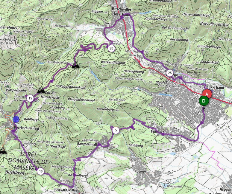 Il culmine à 748m. Pour y accéder depuis Thann, trois possibilités: