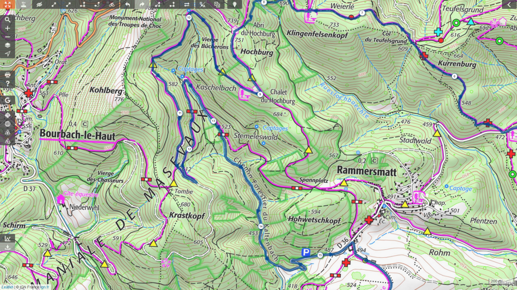 A la cote 455, Croix Rouge! Je prends la Croix Rouge faisant semblant d’oublier que c’est peu roulant. La Croix Rouge monte au col de Teufelsgrund mais le premier kilomètre est un champ de cailloux. Non compatible dirait l’ami Pierre Brunner qui fête ses 300.000 visiteurs uniques.